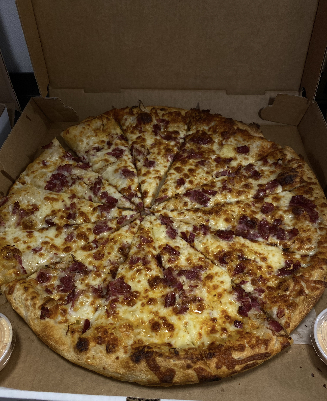 The ever-controversial Hawaiian pizza. Red sauce base topped w shredded mozzarella. We use diced bacon instead of ham, and pineapple tidbits. Don’t knock it till you try it.